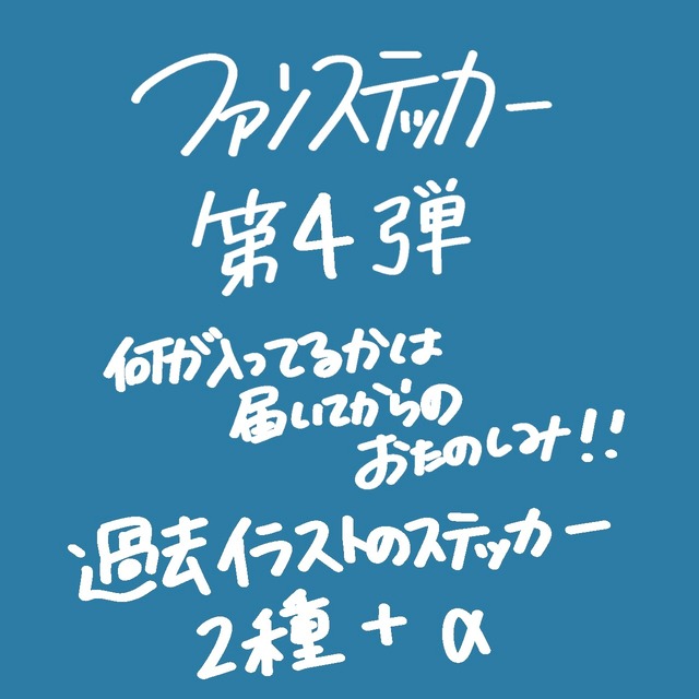 なんのステッカーかは 手元に届いてからのお楽しみ! 楽しみをみなさんに平等に届けたいので 本商品の中身はSNS投稿は禁止です。 楽しむfunと応援するfanをかけて ネーミングを考えました。 今回は過去に配布したあのアイコンのイラストを使った200円相当のステッカー2種類とおまけつき! いずれもスマホ裏に挟まるサイズ感です。